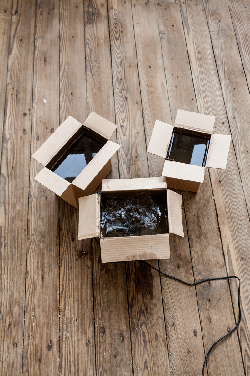 , cardboard, epoxy resin, parcel tape, water, water pump, each box respectively: 20.5x15x19.5cm, 13x13x19.5cm, 11x20x20cm, 2014